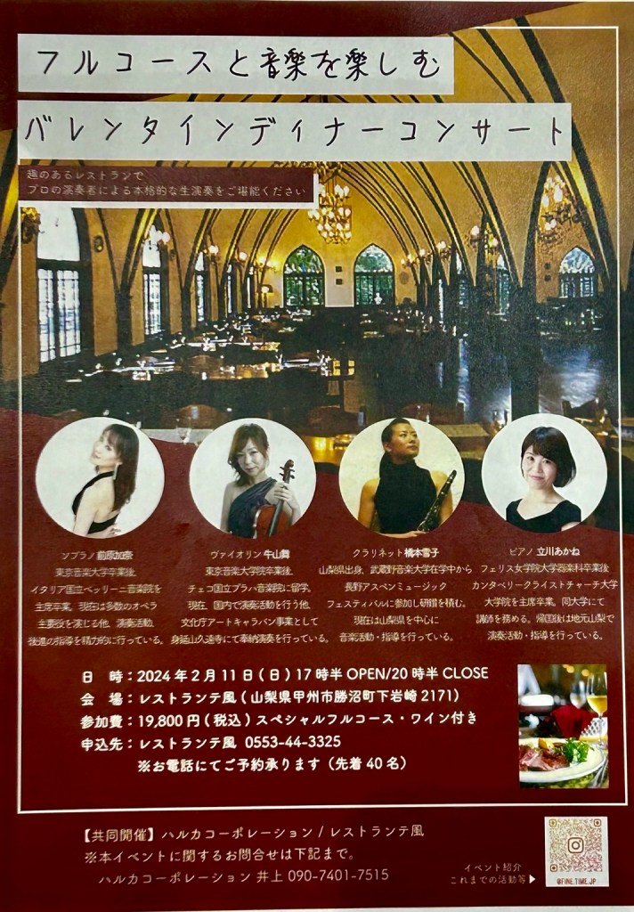 今年のバレンタインはコンサートとレストランテ風のスペシャルフルコース、そして勝沼醸造のワインのマリアージュ